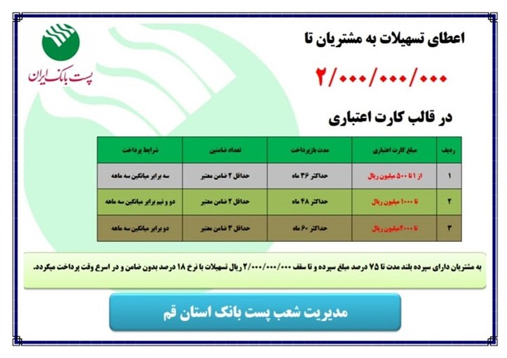 به گزارش پیام خانواده پست‌بانک استان قم در راستای حمایت از تولید کنندگان و  اقشار مختلف مردم اقدام به ارائه تسهیلات در قالب کارت اعتباری تا سقف ۲۰۰ میلیون تومان و بازپرداخت ۵ ساله  کرده است.
