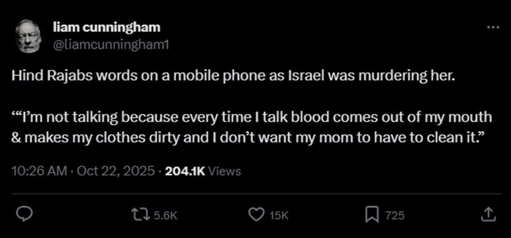 به گزارش پایگاه خبری پیام خانواده؛ لیام کانینگهام، بازیگر گیمآفترونز و از اعضای کاروان صمود در توییتی نوشت: "حرفهای هند رجب (دختر پنج ساله فلسطینی) با تلفن همراه در حالی که اسرائیل داشت او را به قتل میرساند: «من حرف نمیزنم چون هر بار حرف بزنم خون از دهانم بیرون میآید و لباسهایم را کثیف میکند و من نمیخواهم مادرم مجبور شود آنها را تمیز کند!»"