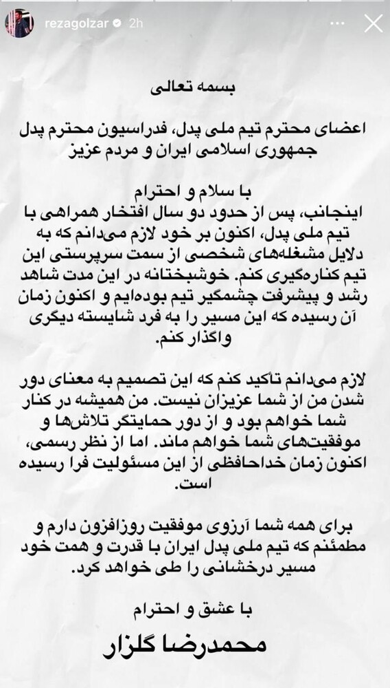 به گزارش پایگاه خبری پیام خانواده؛ محمدرضا گلزار که حدود دو سال پیش به عنوان سرپرست تیم ملی پدل ایران انتخاب شد امروز از سمت خود استعفا کرد. پدل زیر نظر فدراسیون تنیس فعالیت میکند و گلزار که در این رشته فعالیت میکرد به عنوان سرپرست تیم ملی انتخاب شد.