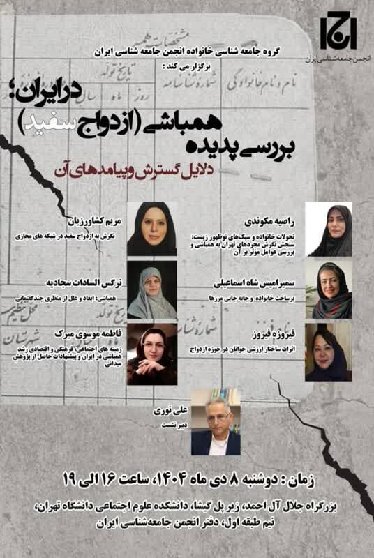 نشست تخصصی بررسی تحولات خانواده و سبک‌های نوظهور زیست با تمرکز بر پدیده همباشی (ازدواج سفید)، با حضور جمعی از پژوهشگران و اساتید برجسته حوزه علوم اجتماعی در انجمن جامعه‌شناسی ایران برگزار می‌شود.