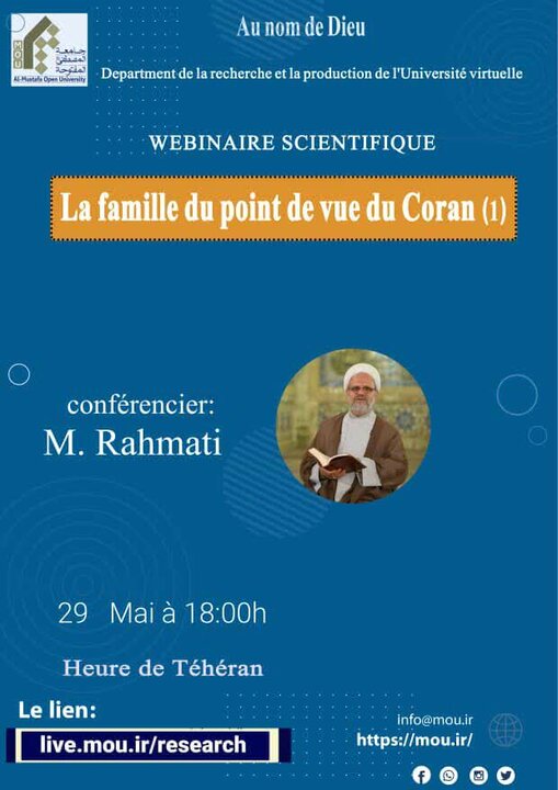 به گزارش پیام خانواده، وبینار علمی خانواده در قرآن با ارایه حجت الاسلام مجتبی رحمتی از اساتید جامعه المصطفی(ص) به زبان فرانسوی از ساعت 18 شنبه 8 خرداد ماه برگزار می شود.